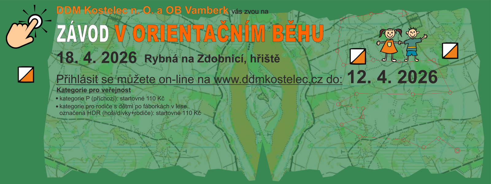 DOPOLEDNÍ LESNÍ ZÁVOD Datum: 18. 4.2026 Místo konání: Rybná nad Zdobnicí, hřiště Start: 10:00 hodin Prezentace do: 09:30 hodin Terén: Zvlněný podhorský les 400 - 550 - m n. m. se středně hustou sítí komunikací, rozmanitá vegetace s rozdílnou průběžností. Kategorie pro veřejnost 1) kategorie P (příchozí): startovné 110 Kč 2) kategorie pro rodiče s dětmi po fáborkách v lese označená HDR (hoši/dívky+rodiče): startovné 110 Kč