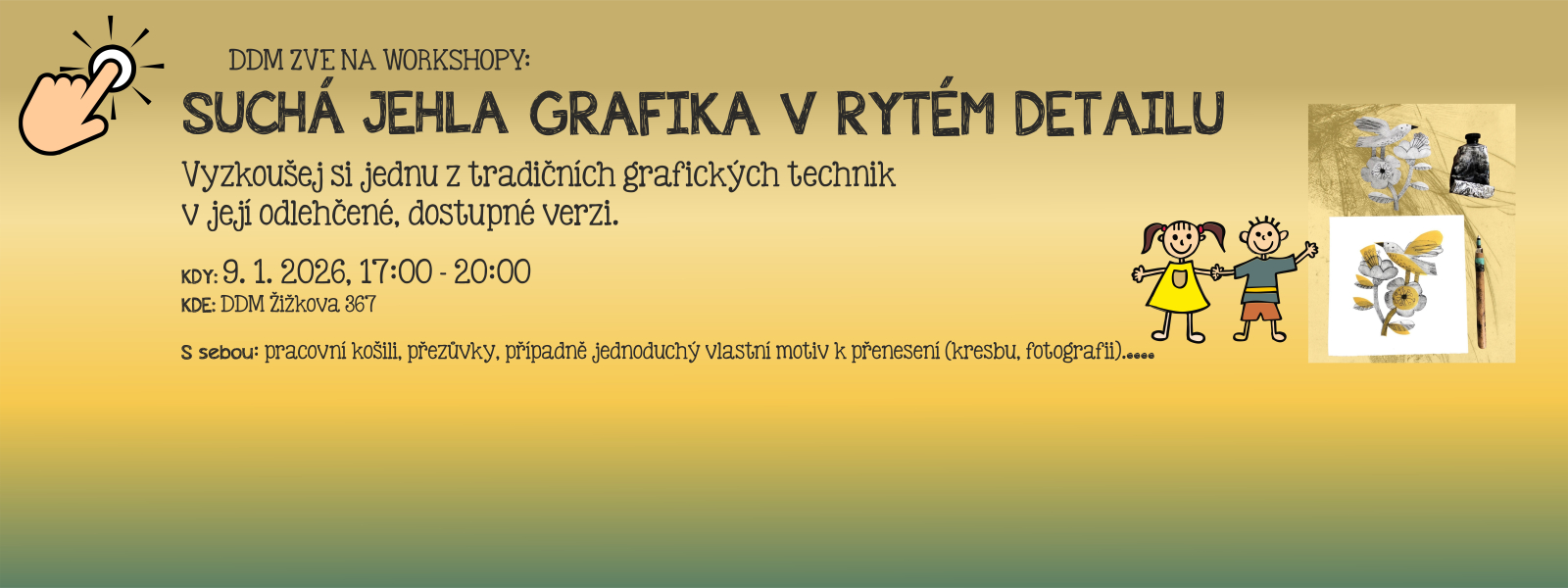 Vyzkoušej si jednu z tradičních grafických technik v její odlehčené, dostupné verzi. Program: • v úvodu se seznámíme s technikou hlubotisku a konkrétně s technikou suché jehly – jedné z nejstarších a nejpůsobivějších grafických technik. • naučíme se, jak si připravit matrici, jak správně rýt do destičky a jak tisknout na speciální hlubotiskový papír. • každý si vytvoří vlastní grafiku a odnese si nejen výsledný tisk, ale i matrici pro další použití. S sebou: • pracovní košili • přezůvky • případně jednoduchý vlastní motiv k přenesení (kresbu, fotografii). Cena: 450 Kč – workshop + 200 Kč balíček pomůcek: grafická jehla, 2 destičky pro rytí, papíry, barva
